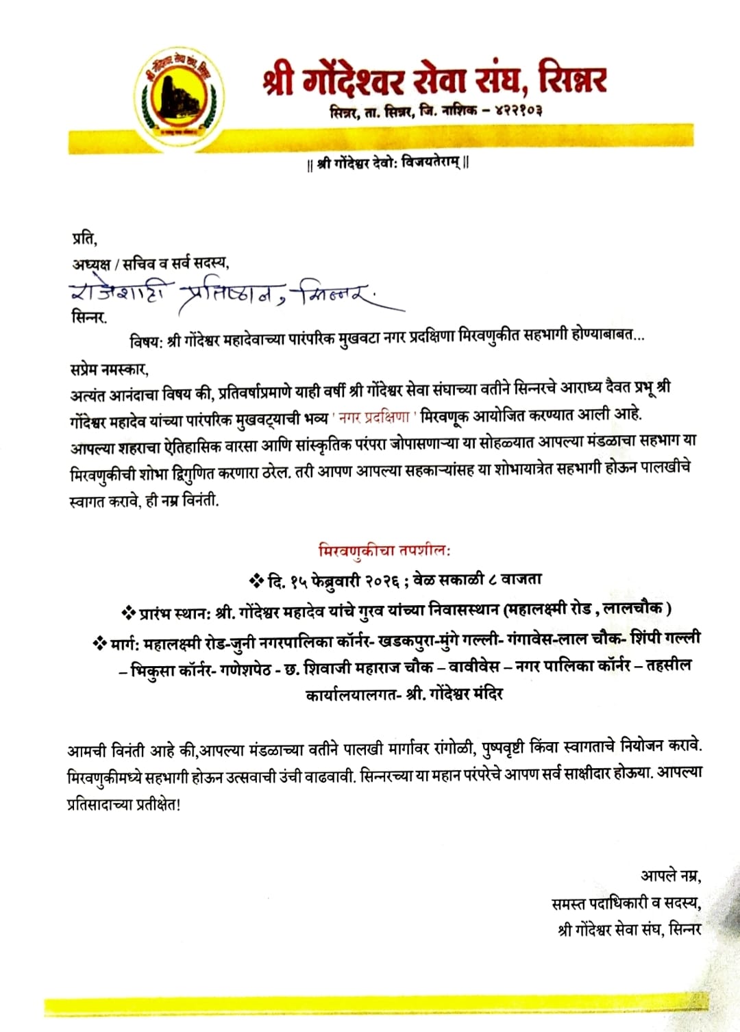 श्री गोंदेश्वर सेवा संघाच्या वतीने सिन्नरचे आराध्य दैवत प्रभू श्री गोंदेश्वर महादेव यांच्या पारंपरिक मुखवट्याची भव्य "नगर प्रदक्षिणा" आयोजित करण्यात आली आहे.